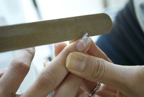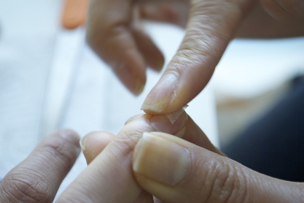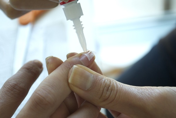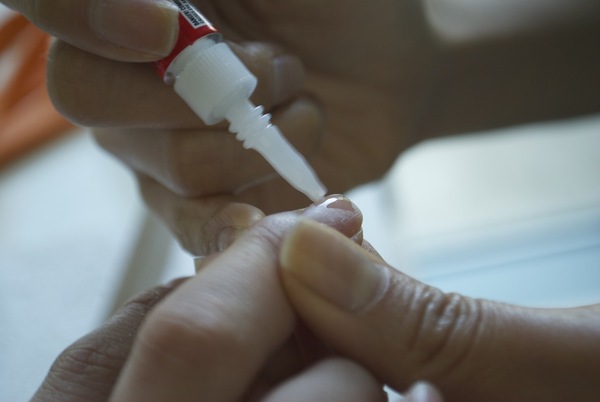 Depois aplica a cola na zona da unha partida e cola o saco de chá.