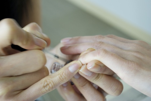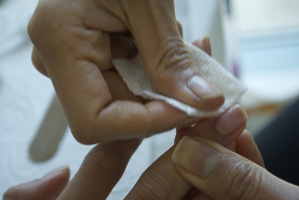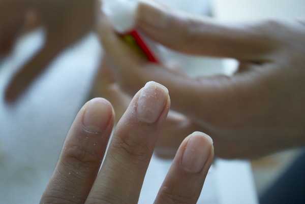 Se tens cola no dedo, retira-a com removedor de verniz.